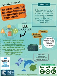 Buscando información y ayuda para poder hacer conciencia sobre este tema, me he dado cuenta de que casi todo el apoyo que dan los programas y organizaciones mundiales para crear e impulsar campañas se lo dan a estudiantes universitarios y adultos. HA SIDO UN POCO DIFÍCIL PORQUE TENGO 14 AÑOS, POR ESO MI IDEA ES BUSCAR PATROCINADORES PARA PODER JUNTAR 1000 BOLSAS PARA REGALARLAS Y EMPEZAR A CREAR CONCIENCIA Y ACEPTAR EL CAMBIO COMO ES. ¿QUIÉN SE UNE AL RETO 3R´S? Reducir, Reciclar y Reutilizar.